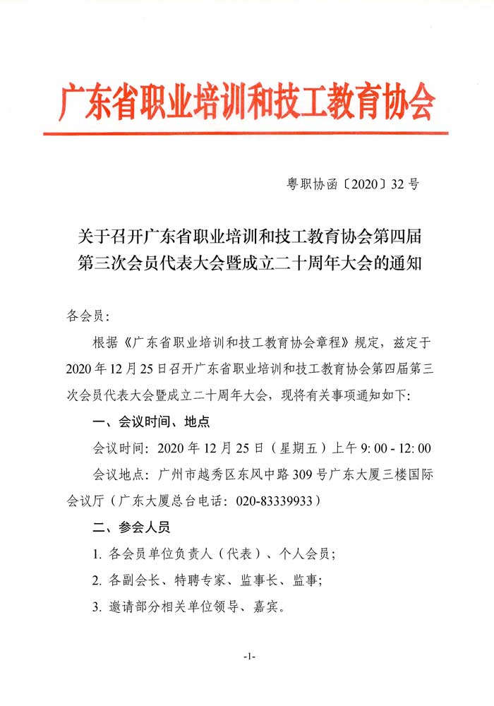 關(guān)于召開廣東省職業(yè)培訓(xùn)和技工教育協(xié)會(huì)第四屆第三次會(huì)員代表大會(huì) 暨成立二十周年大會(huì)的通知