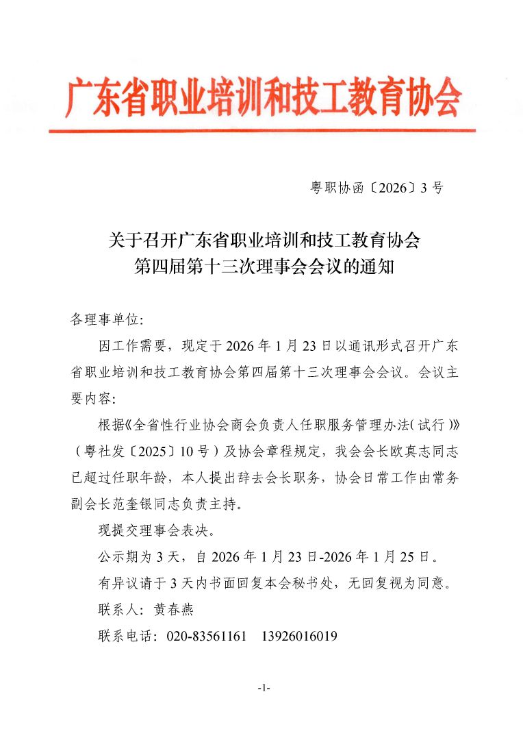 關(guān)于召開廣東省職業(yè)培訓(xùn)和技工教育協(xié)會(huì)第四屆第十三次理事會(huì)會(huì)議的通知