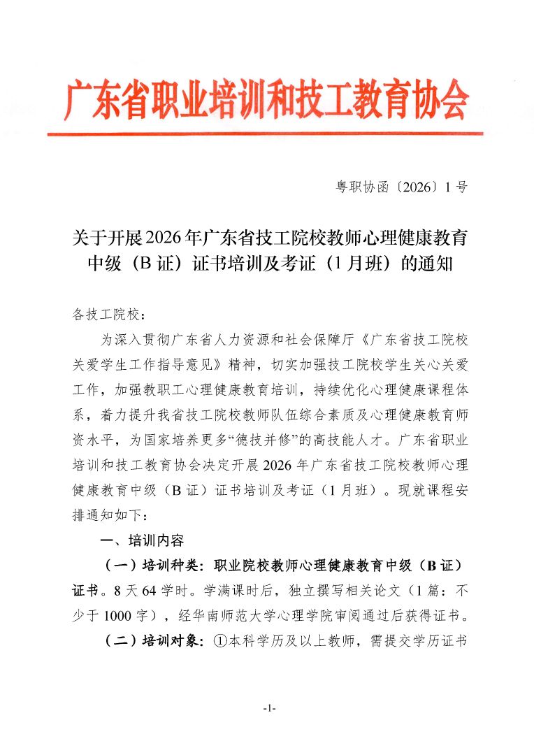 關(guān)于開(kāi)展2026 年廣東省技工院校教師心理健康教育中級(jí)(B 證)證書(shū)培訓(xùn)及考證(1 月班)的通知