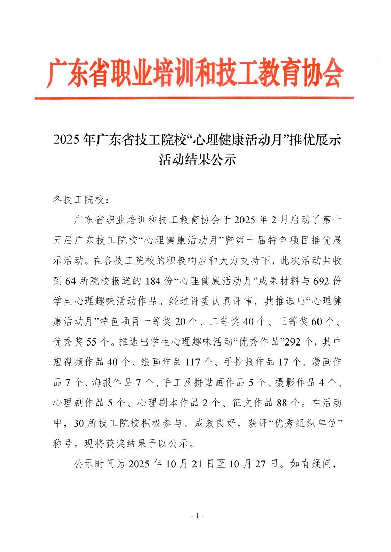 2025 年廣東省技工院校“心理健康活動月”推優(yōu)展示活動結(jié)果公示