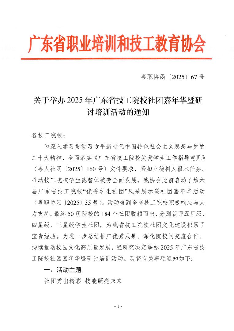 關(guān)于舉辦2025 年廣東省技工院校社團(tuán)嘉年華暨研討培訓(xùn)活動的通知